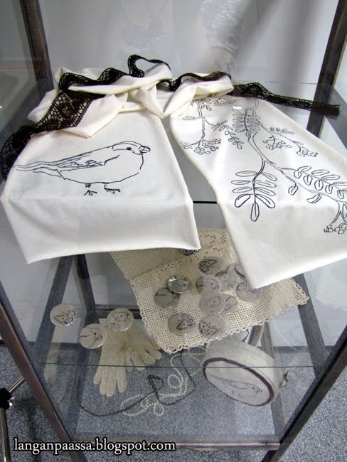 Vitriinissä on esillä tähän mennessä kehittelemäni eläinperheen tuotteet: kaulaliinat, rintanapit ja laukku. Uusia ideoita testaillaan ja aiempia on kehiteltävä vielä, tällä hetkellä lähinnä tuotepakkauksen saralta.